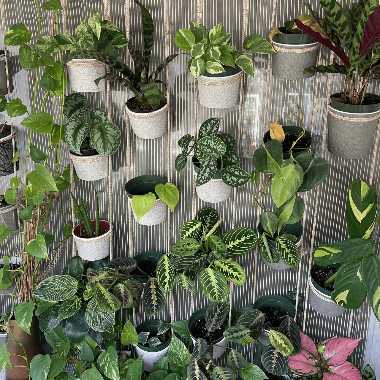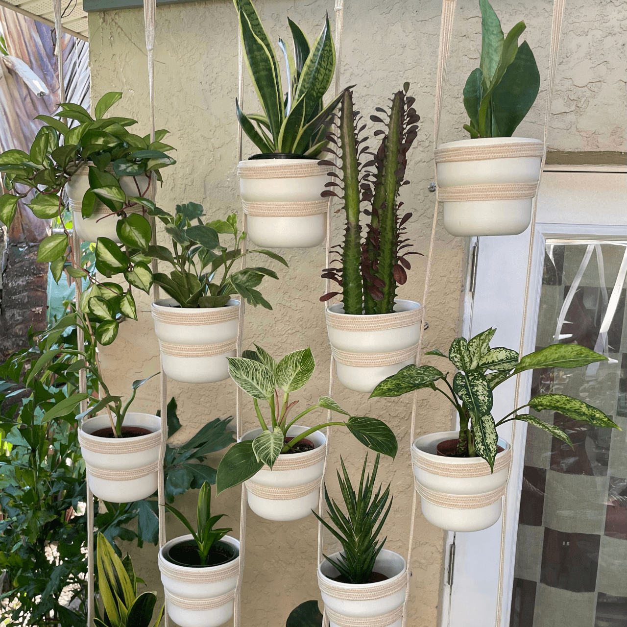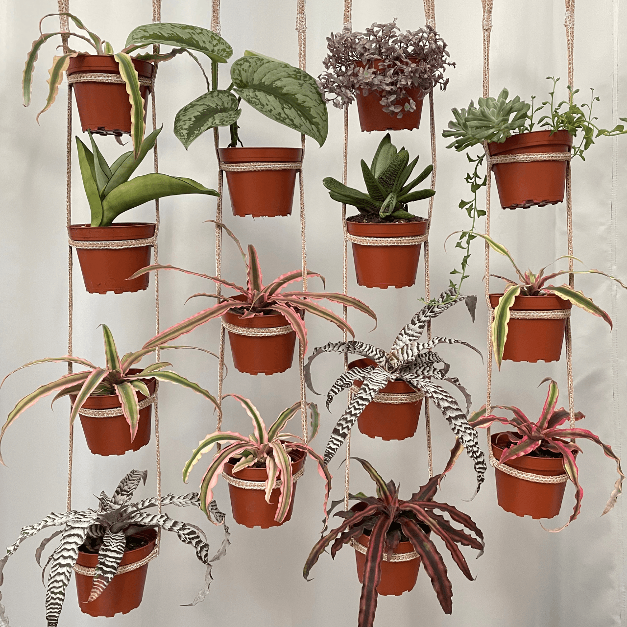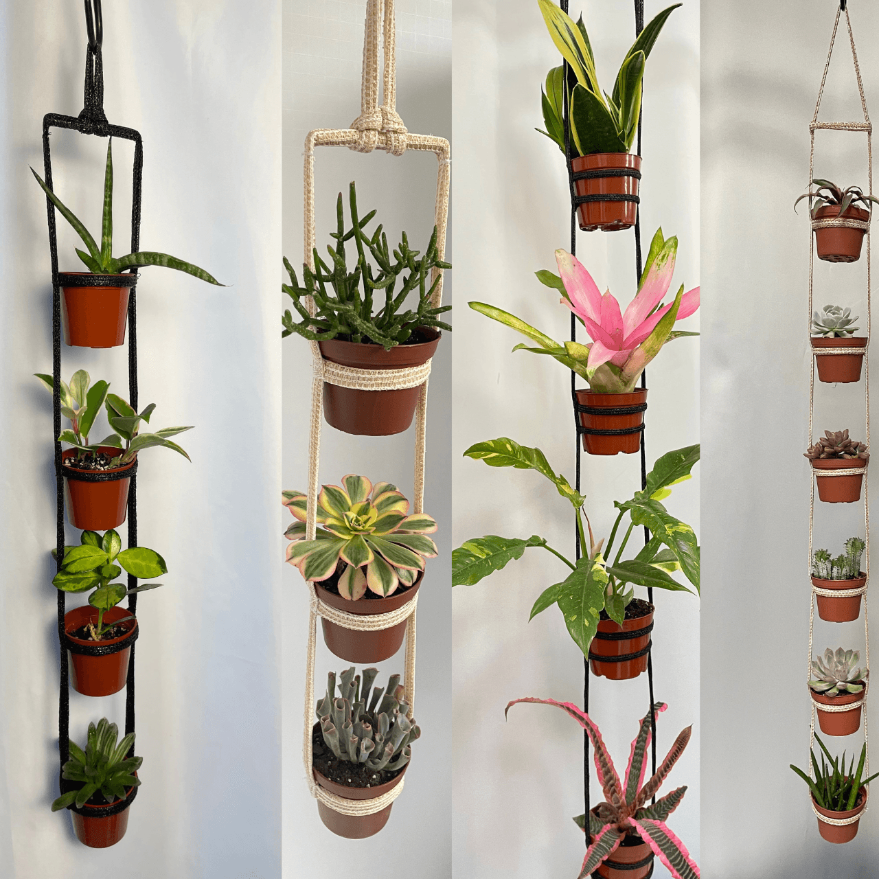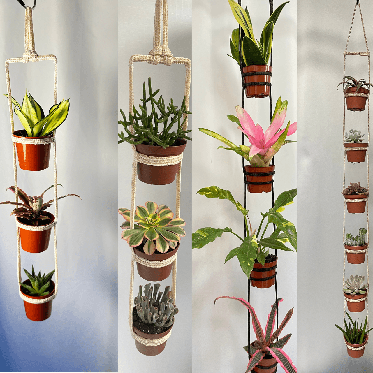 A lightweight multiple-plant hanger made from flexible straps, designed to hold multiple containers of varying sizes!