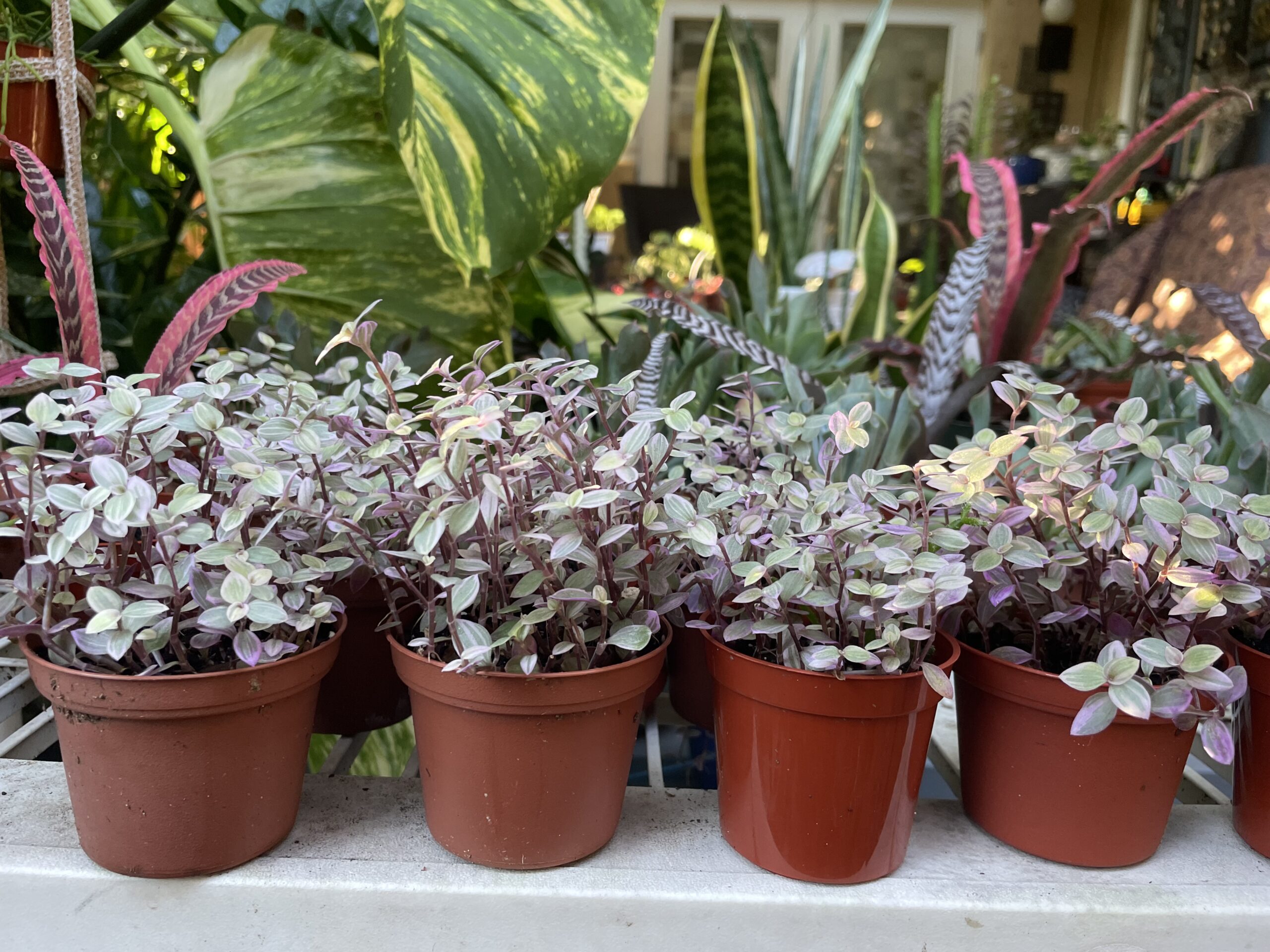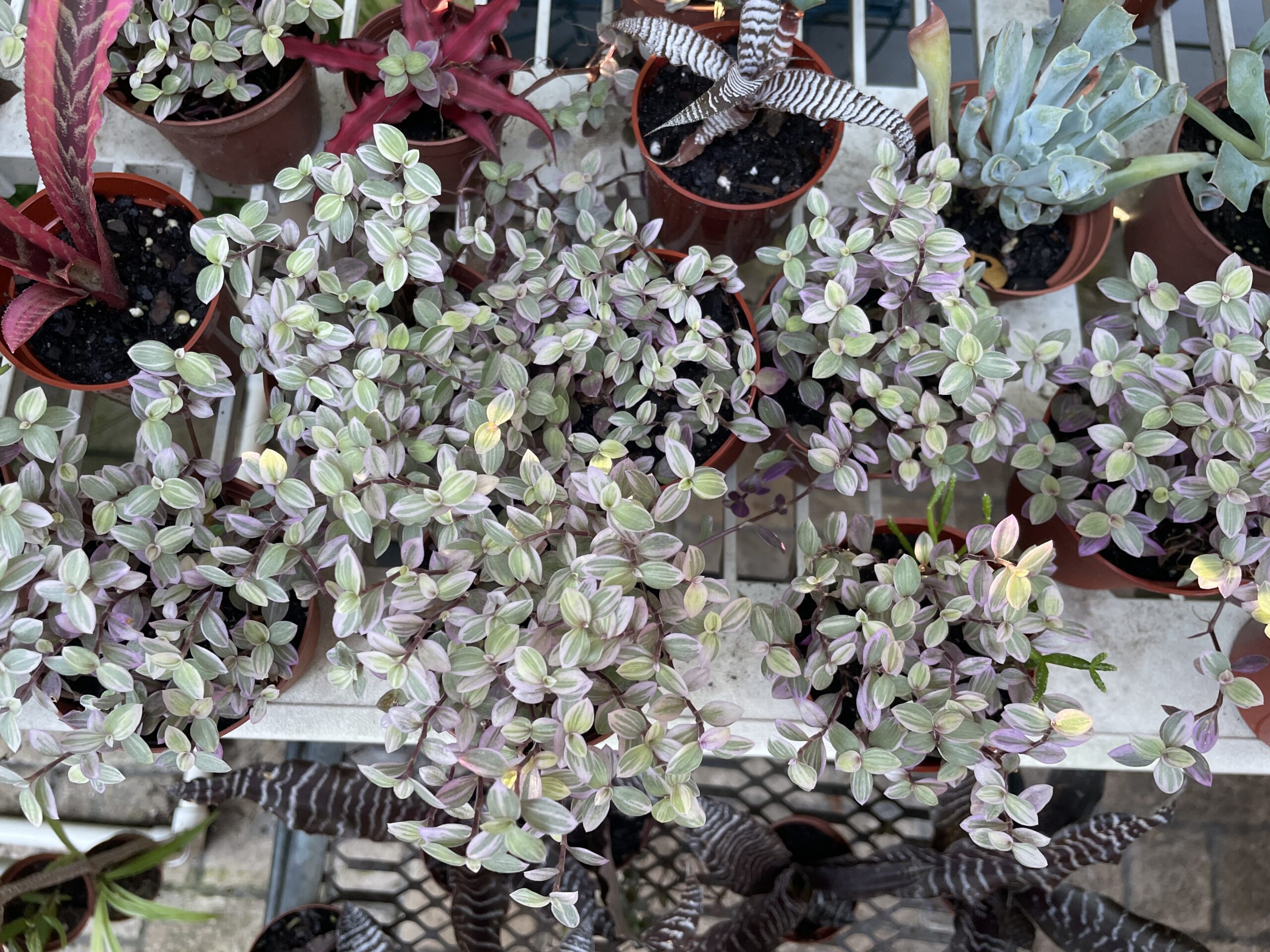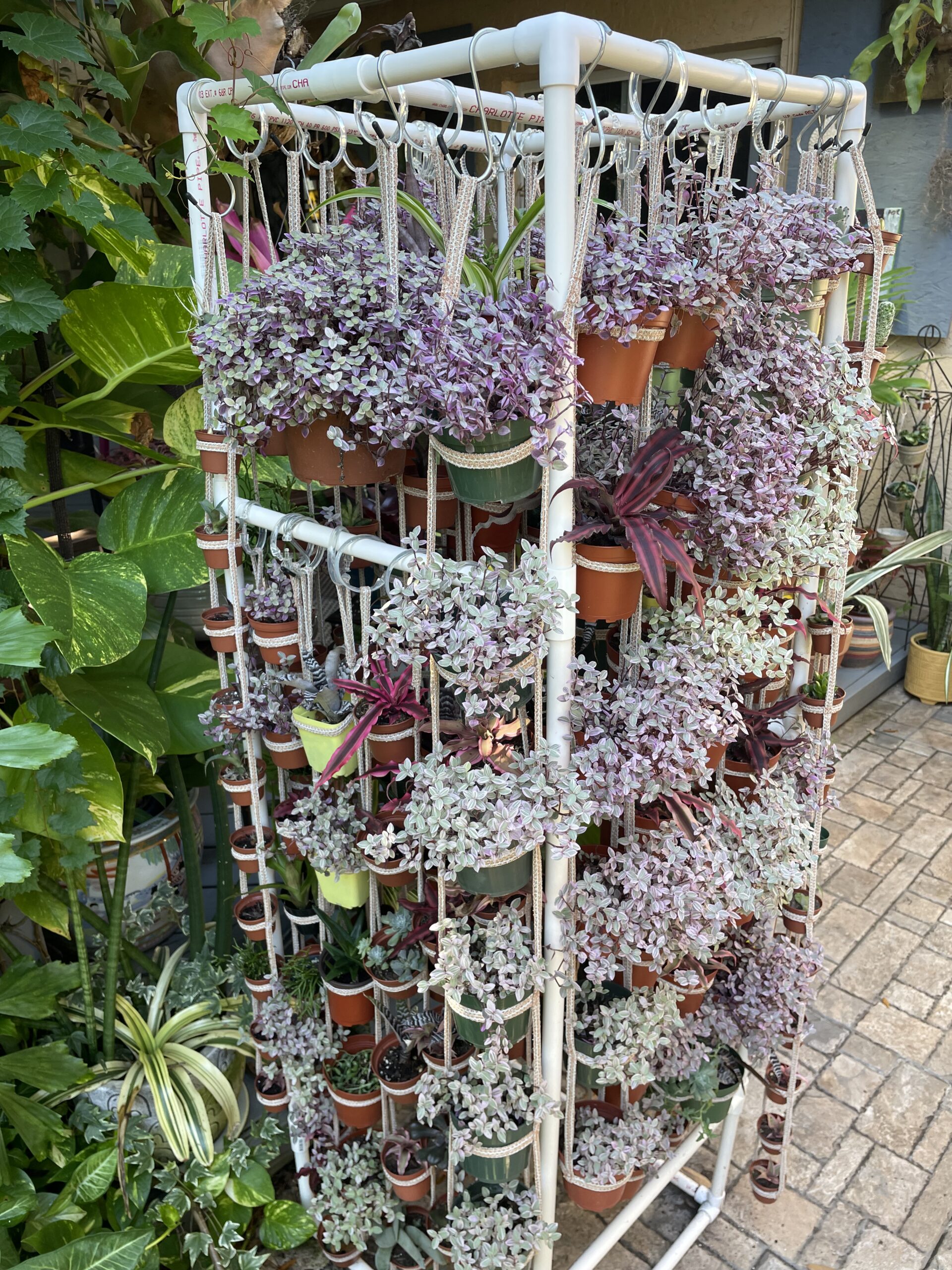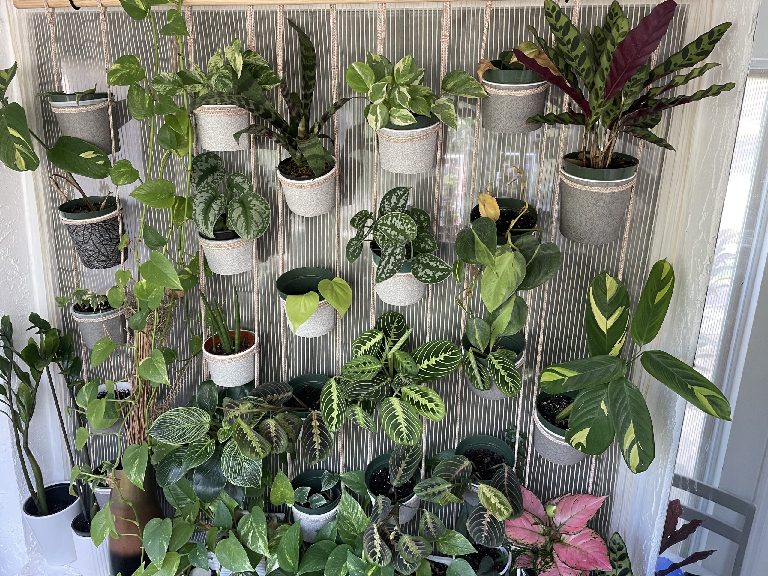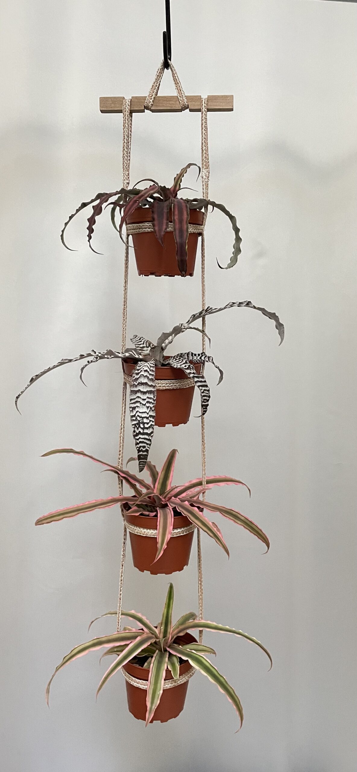 A lightweight multiple-plant hanger made from flexible straps, designed to hold multiple containers of varying sizes!